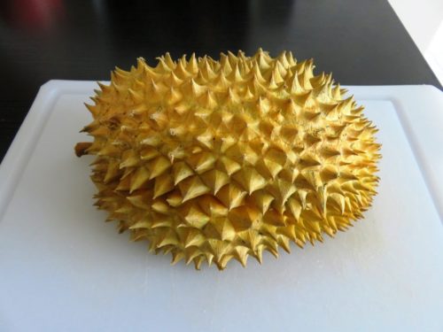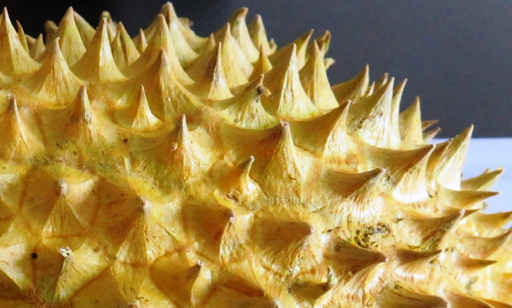 A durian could easily be used as a battle weapon – large, heavy and covered with very sharp spines. Our friend told us there’s a saying that if your husband comes home late from work, he should kneel on one as punishment: