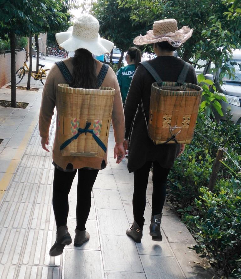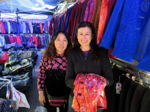 While she was buying Asian fashion, the locals displayed an interesting blend of modern black leggings and traditional shopping baskets: