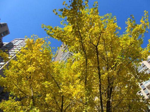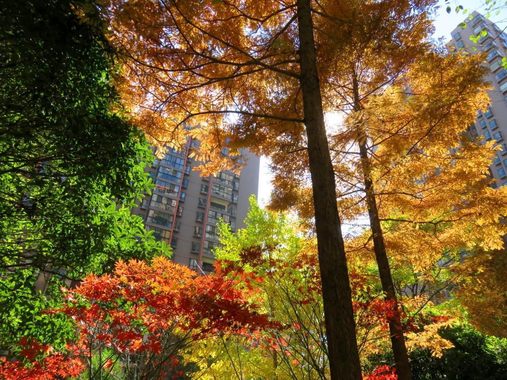 Now that December is here, the “fall colors” have emerged in our apartment complex (the most exciting color is the blue sky in the second photo):