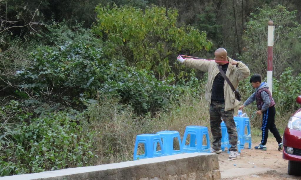On the way down the mountain, we saw a man shooting his slingshot at targets on the opposite side of a ravine: