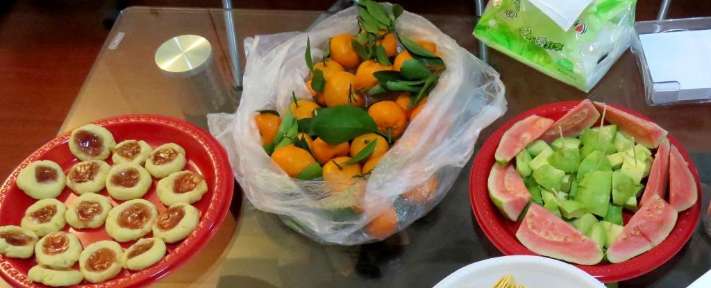 By the way, fruit is the most common snack we and others serve. The photo below shows guava, avocado, oranges, and jam thumbprint cookies baked by Susan: